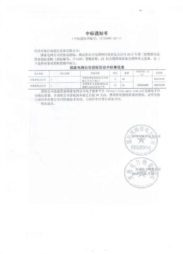 中標河南省電力公司2013年第三批物質協議庫存招標采購